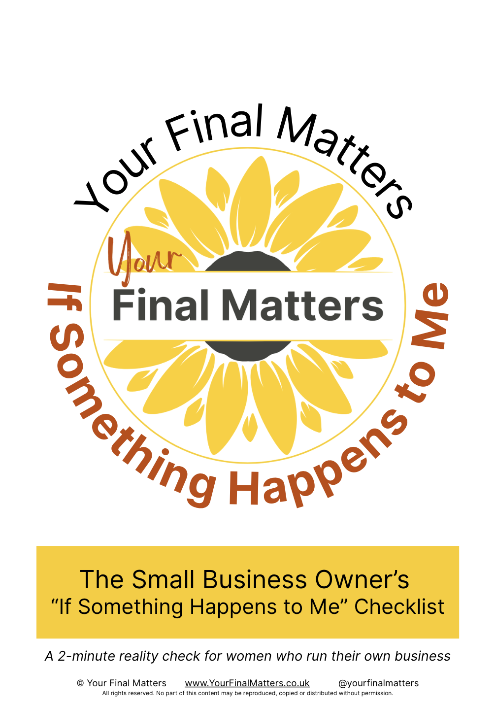 Check out my free practical guide on what you need to do immediately after and during the first few weeks - and add it in to your Your Final Matters folder - so your loved ones can follow a clear plan when they'll need it most.